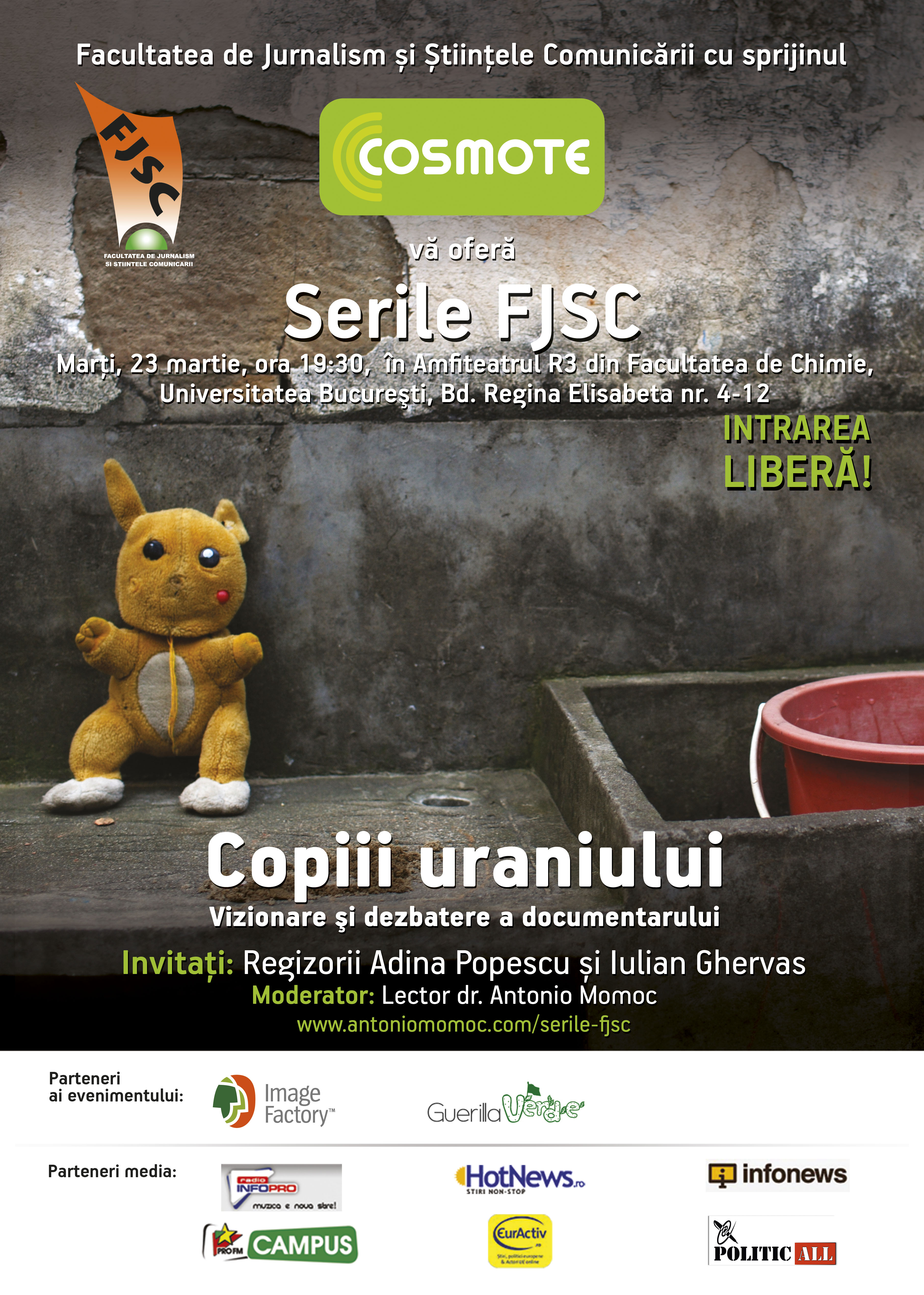 La scurt timp după premiera oficială a filmului documentar “Copiii Uraniului” (care a avut loc pe 19 februarie 2010), pe 23 martie, ora 19:30, la amfiteatrul R3 al Facultăţii de Chimie, din Bd. Regina Elisabeta nr. 4-14 (Piaţa Universităţii) vizionăm acest documentar în prezenţa a cel puţin unuia dintre regizori. Intrarea este liberă ca întotdeauna.