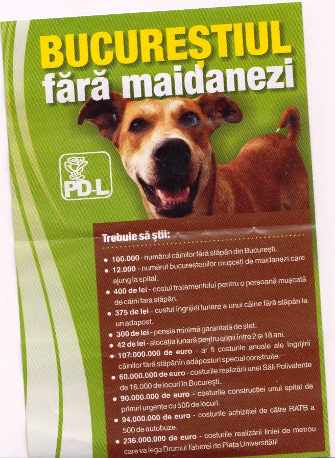 PDL comunică bucureştenilor zilele acestea că dacă semnează pentru omorârea câinilor comunitari, Bucureştiul va deveni un oraş fără maidanezi. Capitala României va fi mult mai frumoasă, mai sigură, mai puţin aglomerată.