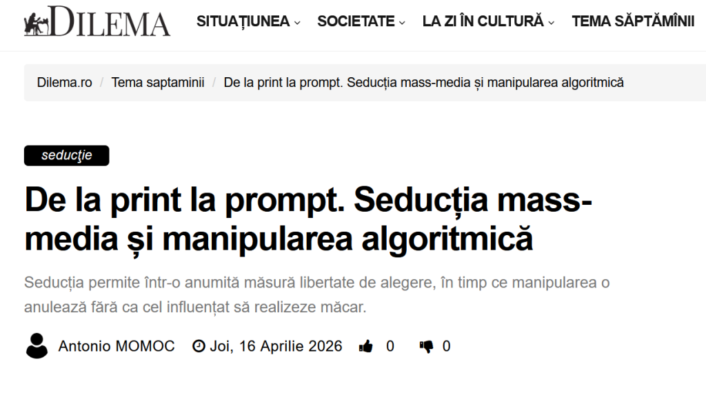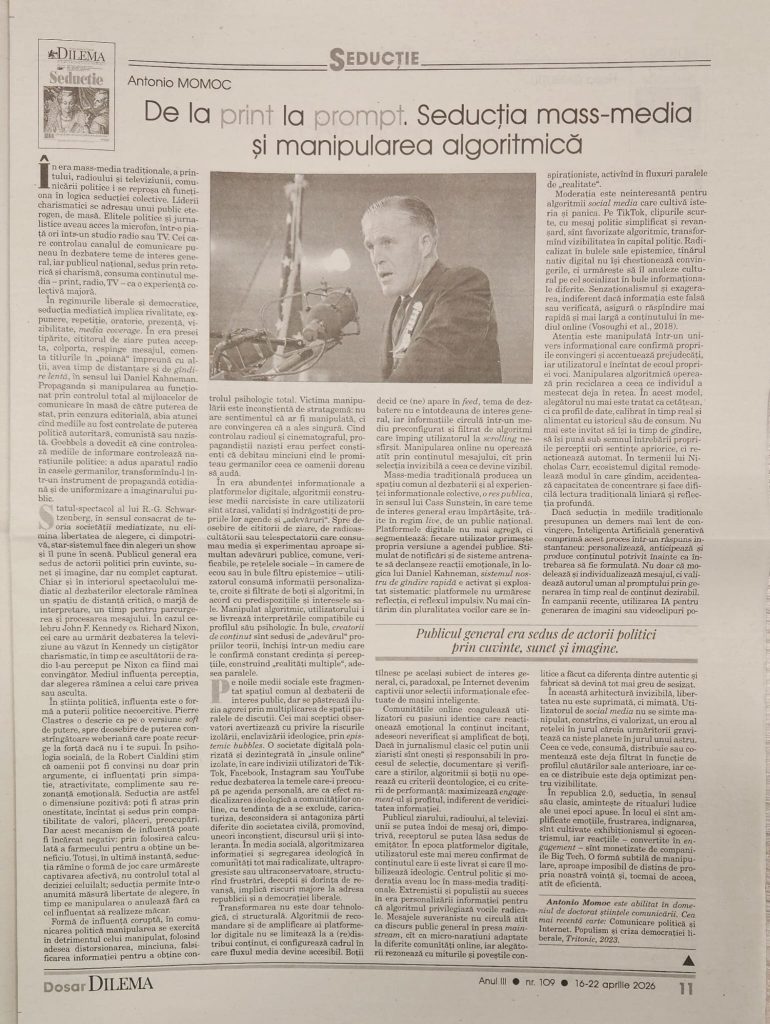 Platformele digitale nu mai agregă, ci segmentează: fiecare utilizator primește propria versiune a agendei publice. Stimulat de notificări și de sisteme antrenate să declanșeze reacții emoționale, în logica lui Daniel Kahneman, sistemul nostru de gîndire rapidă e activat și exploatat sistematic: platformele nu urmăresc reflecția, ci reflexul impulsiv.
